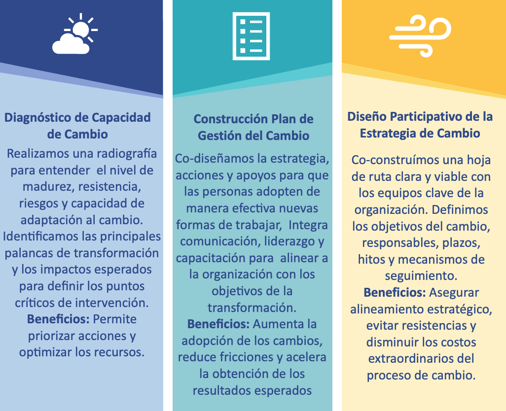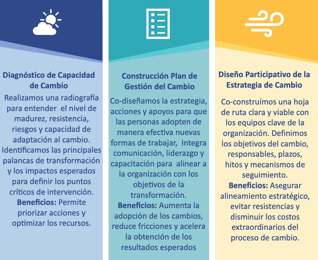 El cambio siempre está presente en las empresas y genera altos costos que generalmente no son percibidos. Las personas por naturaleza son reacias a adaptarse a los cambios, prefieren no tenerlos y generan resistencia cuando perciben incertidumbre. Nuestra propuesta de servicios combina diagnóstico, alineamiento, capacitación, acompañamiento, medición y refuerzo para convertir la intención de cambio en transformación real.