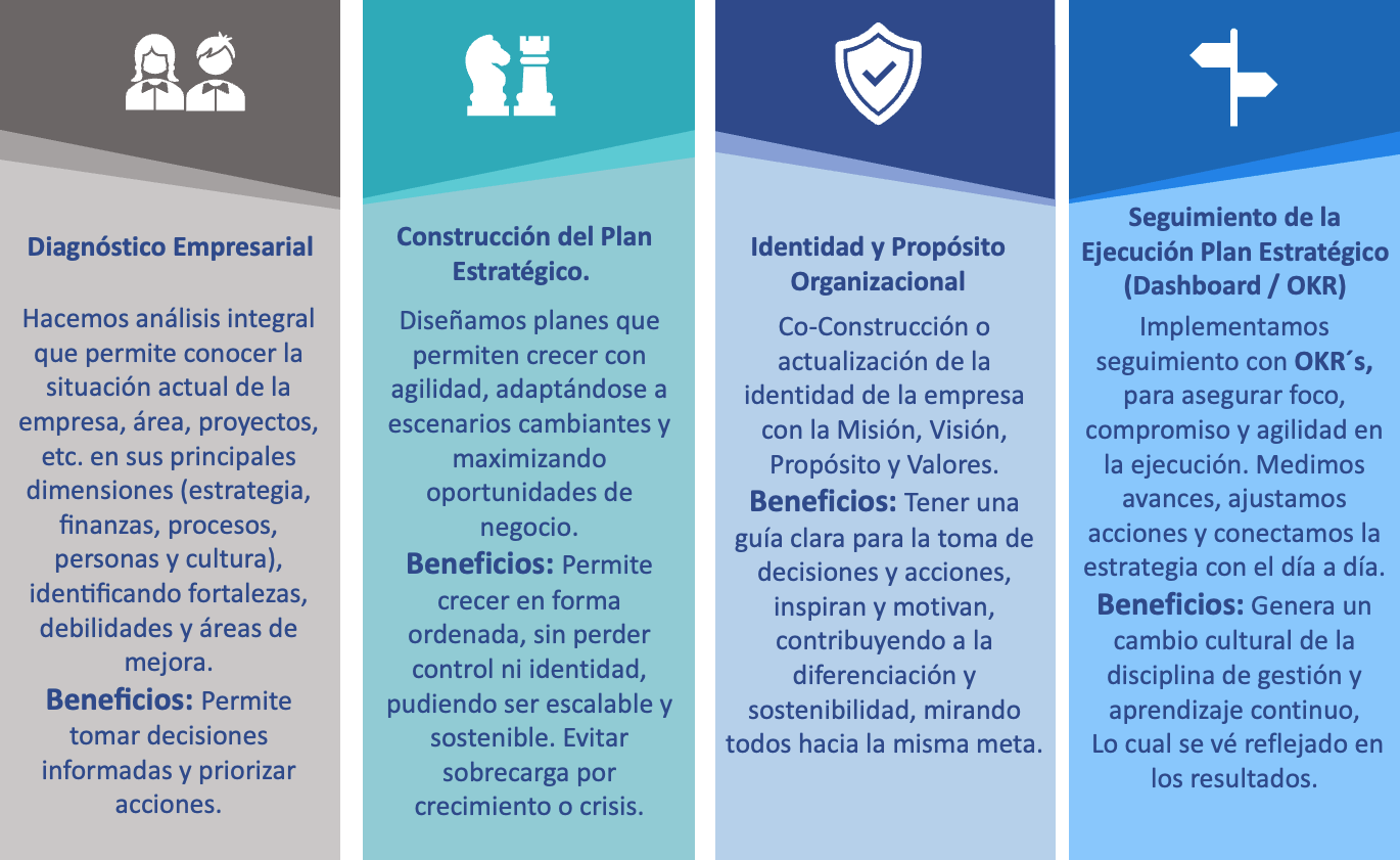 Co-Construimos estrategias en diferentes escenarios, que nos permite acompañar a personas y equipos en cada etapa del proceso para el logro de sus objetivos, asegurando acciones cumplibles con resultados que generen productividad, rentabilidad y sostenibilidad. Nuestra propuesta combina diagnóstico, marco estratégico, proyección, alineamiento, capacitación, acompañamiento, coaching y seguimiento con mediciones concretas.