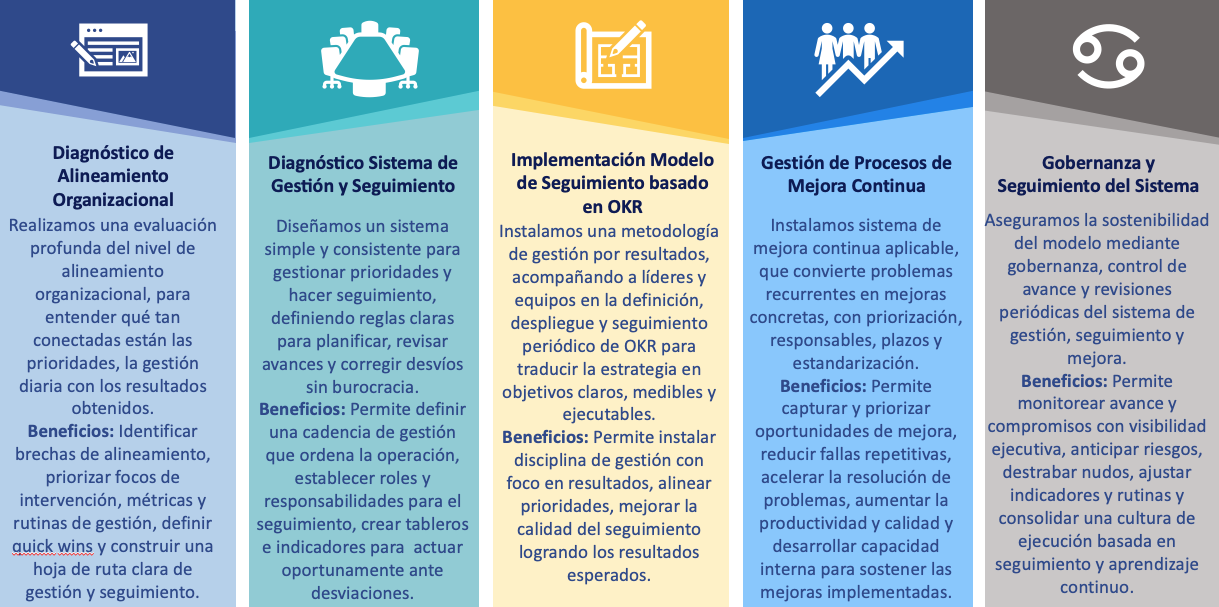 Te ayudamos a traducir tu estrategia en acciones concretas que toda la organización pueda entender, seguir y medir. Nuestro enfoque de alineamiento asegura que líderes y equipos trabajen con un mismo lenguaje y prioridades compartidas, evitando esfuerzos dispersos y duplicados.
