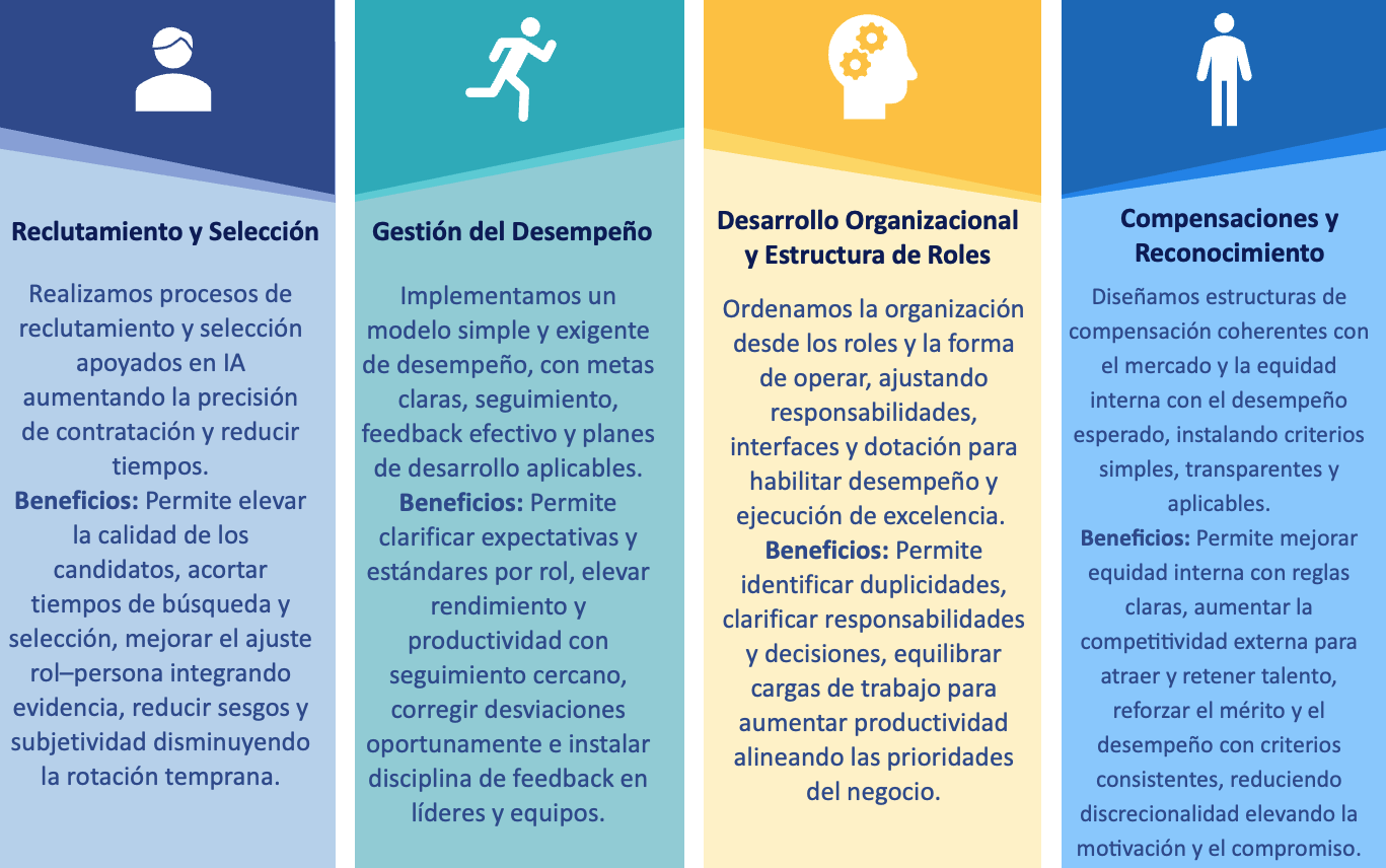 Ofrecemos una propuesta integral de gestión de personas que acompaña a las organizaciones en todas las etapas del Employee Journey, asegurando que cada experiencia del colaborador esté estrechamente conectada con la estrategia, la cultura y los valores corporativos. Nuestros servicios permiten construir procesos coherentes y sostenibles que potencian el liderazgo, fortalecen la motivación y promueven entornos de trabajo saludables. De esta manera, generamos mayor compromiso y productividad, al mismo tiempo que contribuimos a la consolidación de culturas organizacionales sólidas y a la sostenibilidad del negocio en el largo plazo.