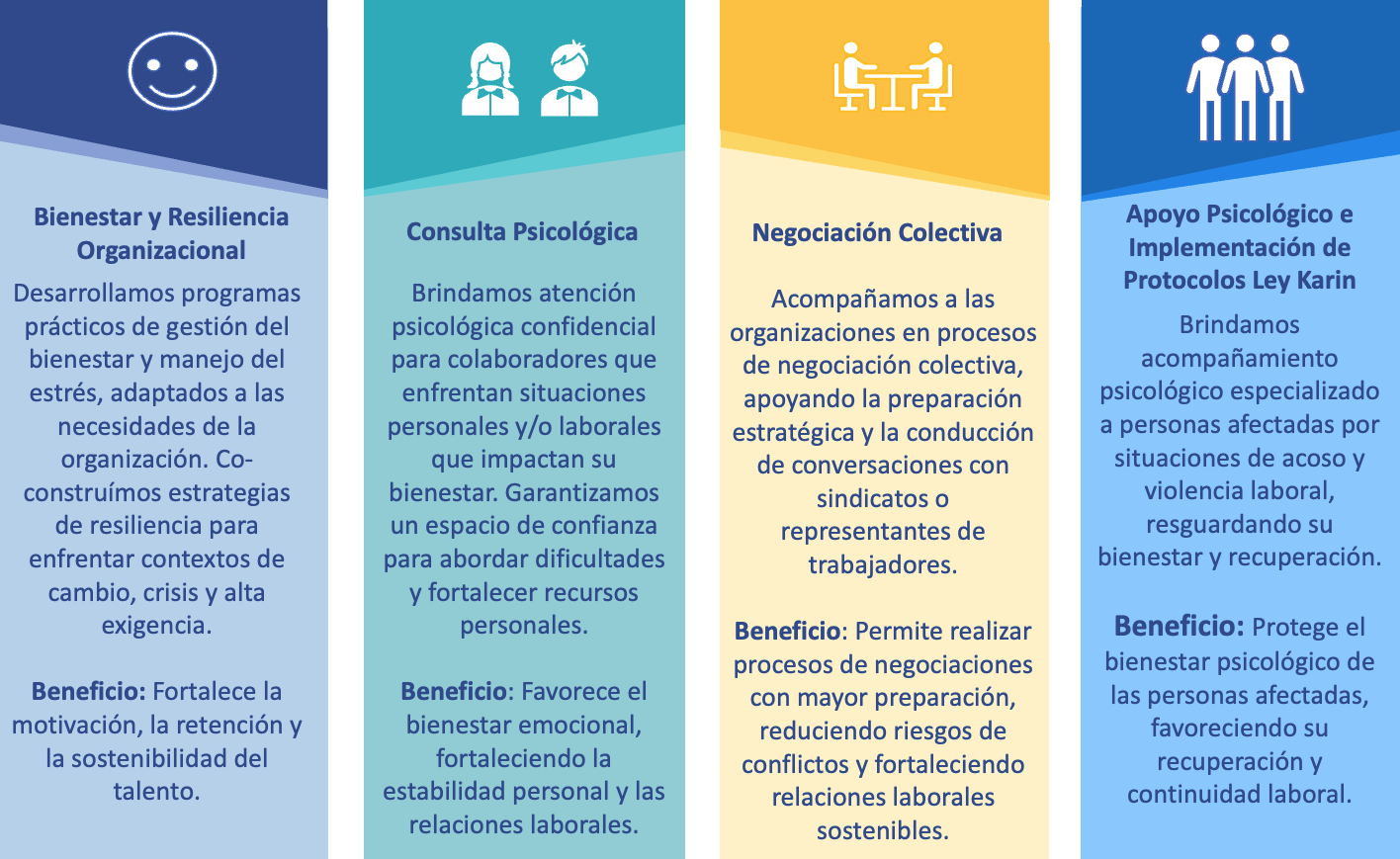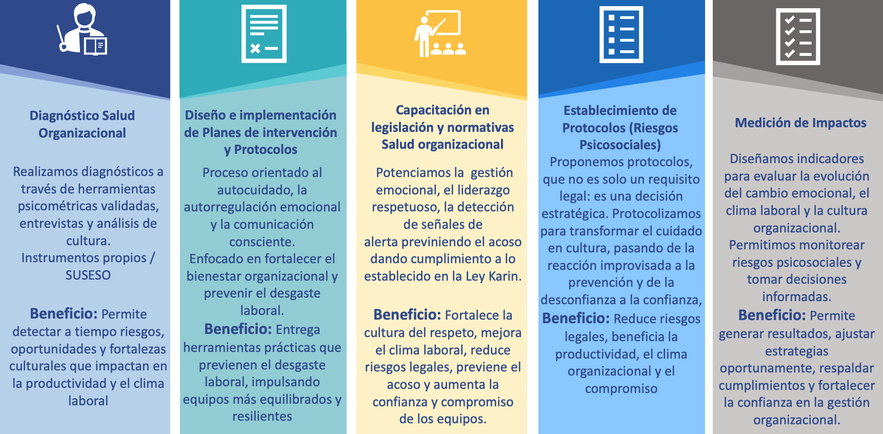 Diseñamos e Implementamos un modelo integral y personalizado de cuidado de la salud mental laboral que promueva el bienestar emocional, la cohesión de los equipos, la prevención del riesgo psicosocial y el cumplimiento de la normativa vigente (incluida la Ley Karin), contribuyendo así a la Salud Organizacional.