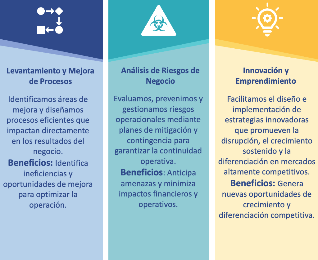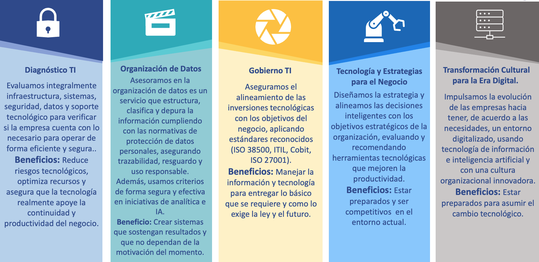 Ofrecemos soluciones integrales que abordan el levantamiento y roadmap necesario de las tecnología, aplicaciones, procesos y administración de información base que requiere la organización. Nos enfocamos en impulsar la innovación y maximizar el valor de la inversión en tecnología, para lo cual usamos un enfoque proactivo en la gestión de riesgos y la adopción de las últimas tendencias tecnológicas, ayudando así a mejorar la eficiencia operativa, aumentar la productividad y fortalecer la competitividad de la organización.