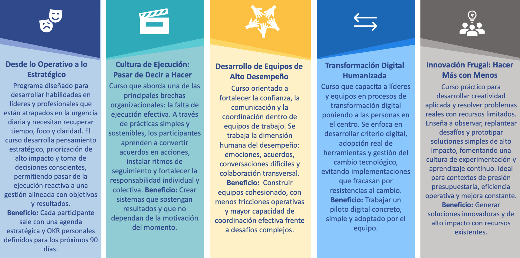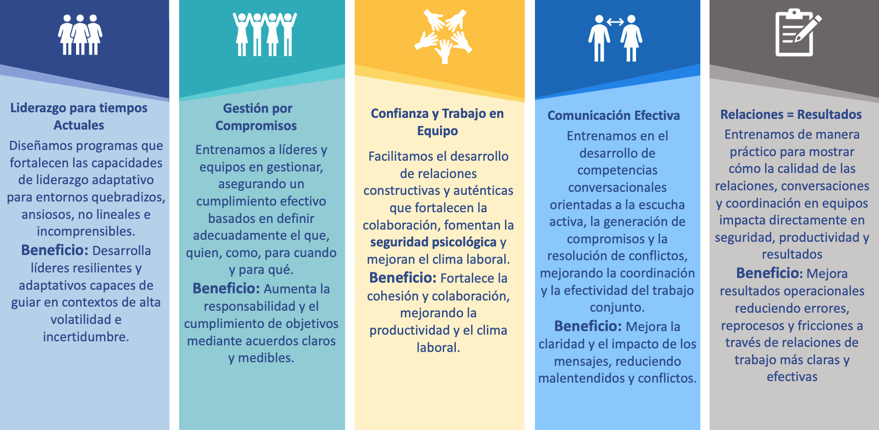 Nuestros servicios están orientados principalmente a acompañar a las organizaciones en procesos de transformación organizacional, para lo cual identificamos y generamos planes orientados a desarrollar las competencias clave que requieren adquirir las personas, con foco en que sean prácticos, relevantes y altamente efectivos para contribuir a enfrentar los desafíos del entorno actual y alcanzar los objetivos estratégicos de la organización.